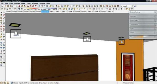כדי להגדיר את התאורה , ראשית נבחר את סוג התאורה מתוך סרגל הכלים ונמקם אותו כך שיהיה קצת יותר נמוך מהספוטים ויפנה קצת אל הקיר.